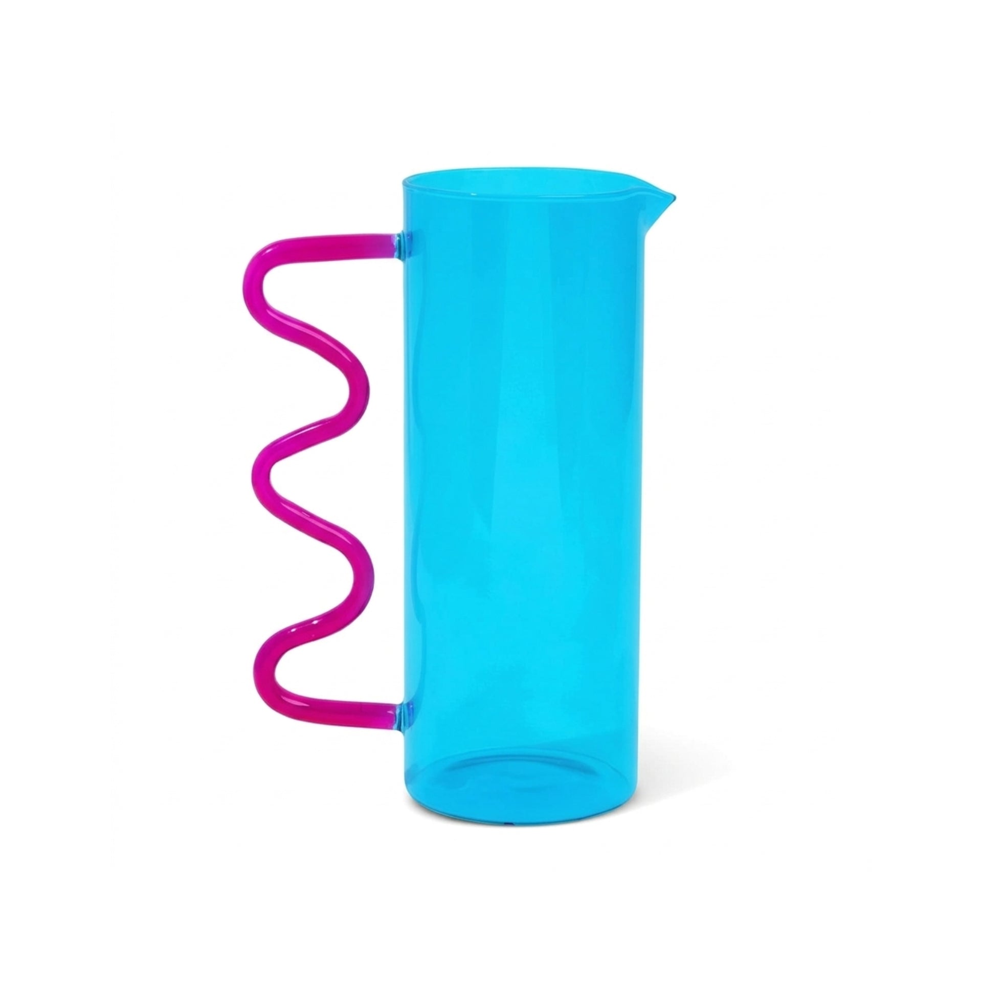Introducing the Squiggle Pitcher. Featuring a unique and ergonomic squiggle handle, this pitcher comes in three vibrant colors to add a touch of personality to your kitchen. Made for easy pouring and a comfortable grip, it's the perfect addition to any gathering or meal.